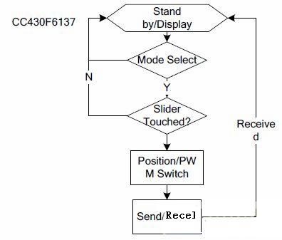 控制端/接收端軟件的流程圖如圖9 所示,其中虛線上方為控制端CC430F6137 的軟件設(shè)計(jì),在Stand By 模式時(shí)保持MSP430 的低功耗模式,以滿足控制端遙控器對(duì)能耗的要求。通過對(duì)模式選擇的操作實(shí)現(xiàn)集中控制和多點(diǎn)操作,而觸摸滑條的處理通過將Position 轉(zhuǎn)換為PWM由RF發(fā)送至接收端CC430F5137。接收端則處理來自控制端的數(shù)據(jù)包,對(duì)LED 照明進(jìn)行亮度調(diào)節(jié),或自動(dòng)調(diào)節(jié)。本設(shè)計(jì)的軟件采用C 語言編寫,整個(gè)程序包括的子模塊有:模式選擇模塊,觸摸滑條檢測模塊,數(shù)據(jù)發(fā)送/接收模塊,PWM轉(zhuǎn)換模塊,傳感器檢測模塊等幾個(gè)部分。