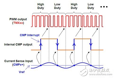 對(duì)于開關(guān)電源,PWM占空比決定輸出電壓,如圖3,電路開始工作后,LED電流經(jīng)采樣后加到MCU內(nèi)置比較器端口,和參考值進(jìn)行比較,產(chǎn)生中斷信號(hào),來 調(diào)整PWM的占空比,其變化過程見圖4,如當(dāng)電流大于參考值時(shí),降低占空比;反之,提高占空比,最終達(dá)到一個(gè)負(fù)載電流動(dòng)態(tài)穩(wěn)定的狀態(tài)。